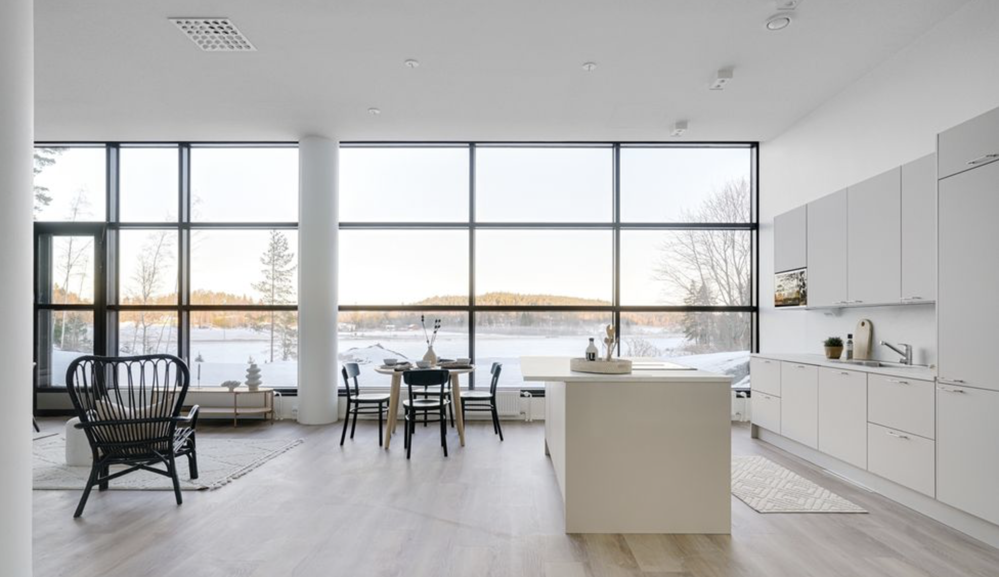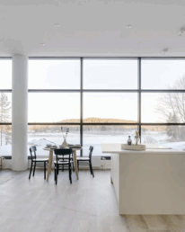 Den öppna utsikten mot naturen, den höga takhöjden, det stilfulla gråa köket och ett övre mindre loft som passar för barnbarnen. Sådan är en av Hotell Siuntios bostäder som byggts i anslutning till hotellet.